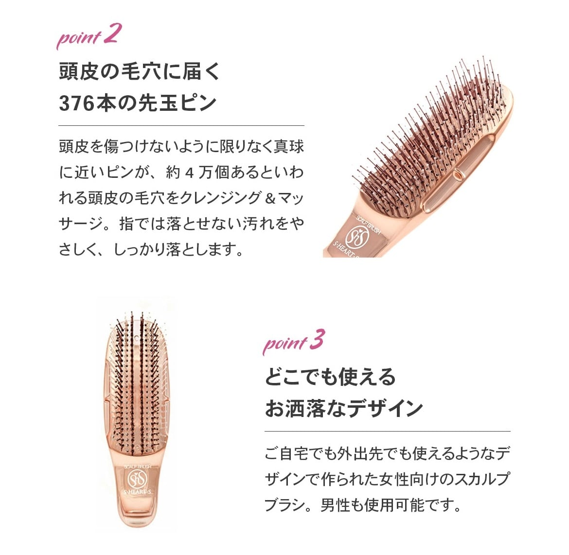 エス・ハート・エスが提供するレディース用スカルプブラシ"ワールドモデル ショート"。 376個の先玉ピンと段差植毛、頭皮密着設計で毛穴の汚れを除去。 シャンプー、トリートメント、頭皮のマッサージなど複数シーンで使えるスカルプブラシ。