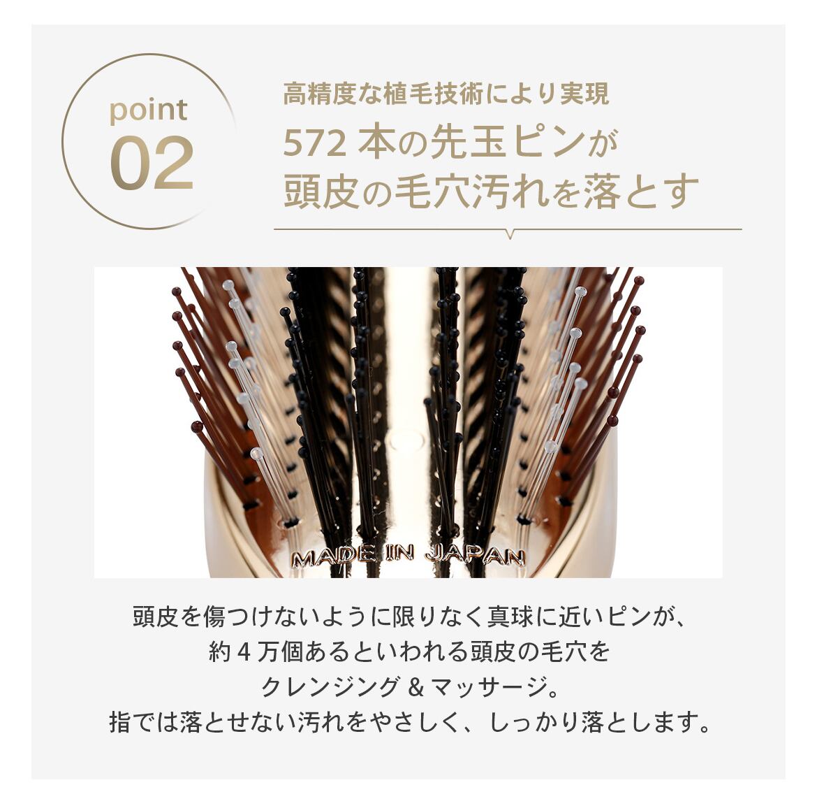 572個の先玉ピンが毛穴の汚れをしっかりと取り除き、清潔な頭皮へと導きます。段差植毛の工夫により、より多くの刺激を与えつつ、優しいマッサージ感を実現。